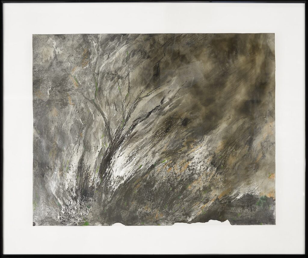 Charcoal, fumage, pieces of burnt wood and acrylic on paper