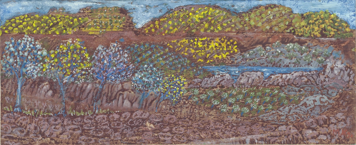 Hills and vegetation are rendered almost pointillist with touches of various bright colors.