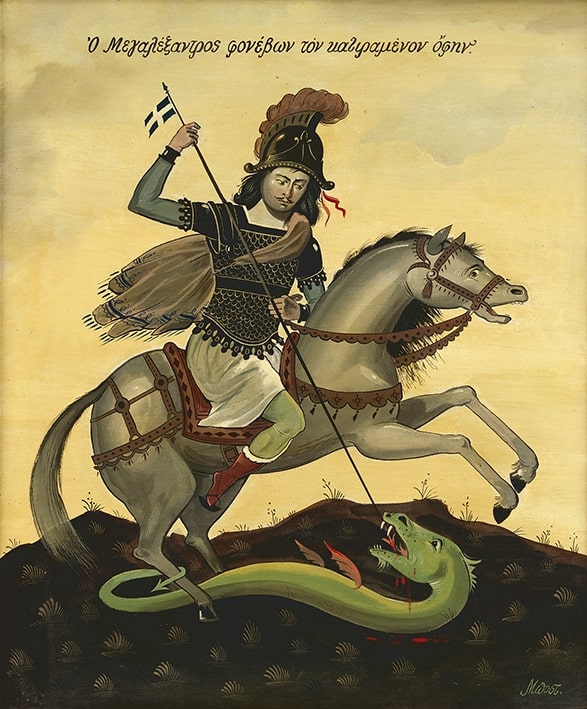 Alexander the Great is depicted wearing a helmet and breastplate on a white horse galloping to the right, slaying a dragon with a spear bearing the Greek flag at the end.