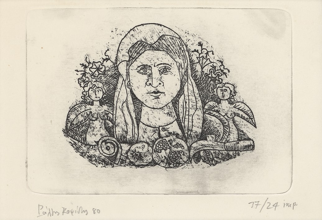 female figure is depicted in the center of the composition and on either side of her are two angels