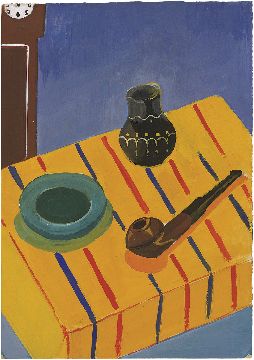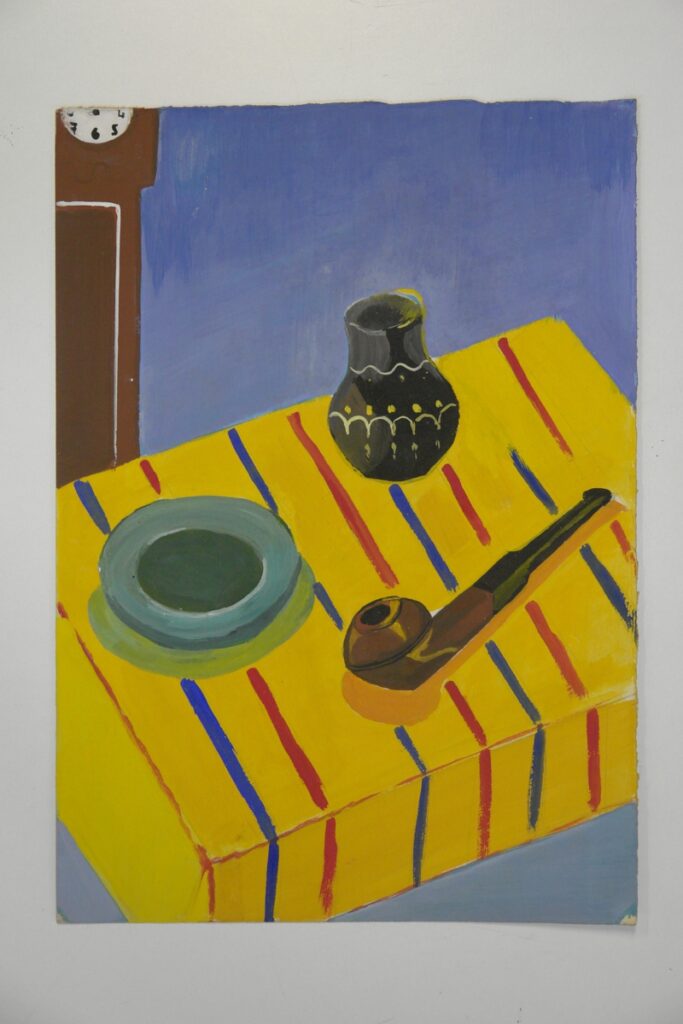 Still life with pipe, plate, jug, clock and yellow tablecloth.