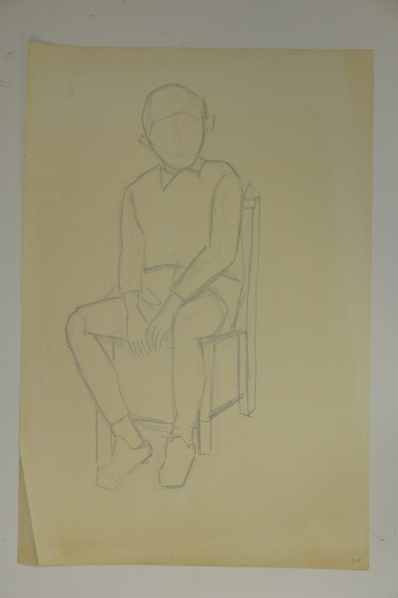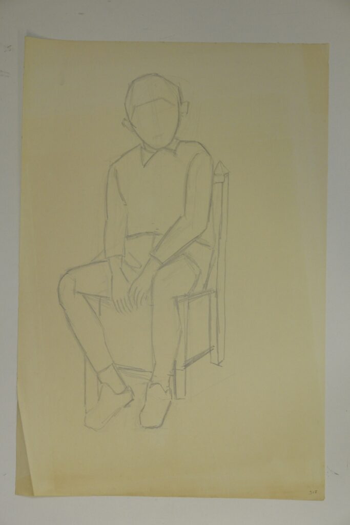 Boy seated in chair (head to front, body turned 3/4 to left).