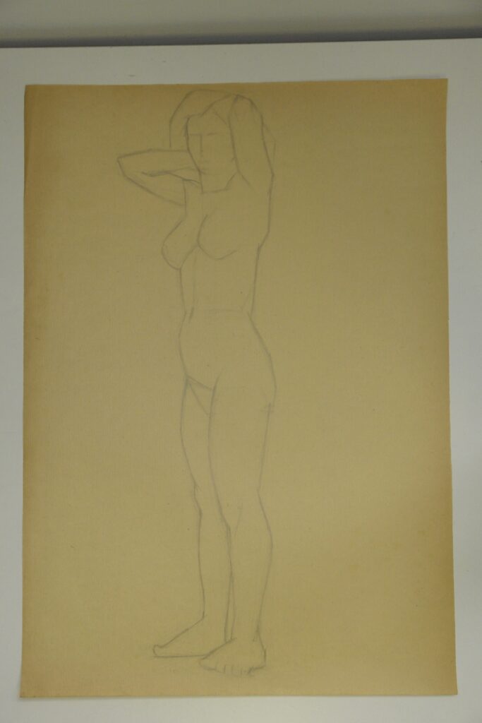 Female nude standing 3/4 turn to left and upper limbs above head