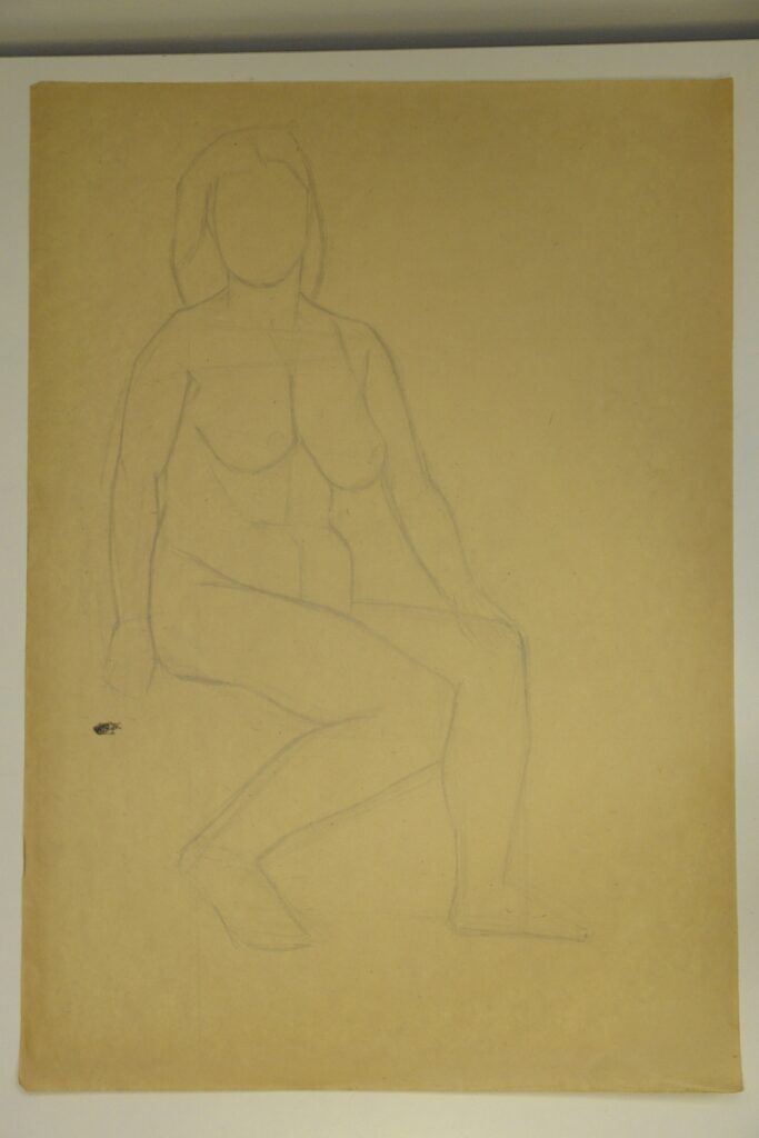 Seated female nude with head to front, torso slightly inclined 3/4, lower limbs in sharp 3/4 turn.