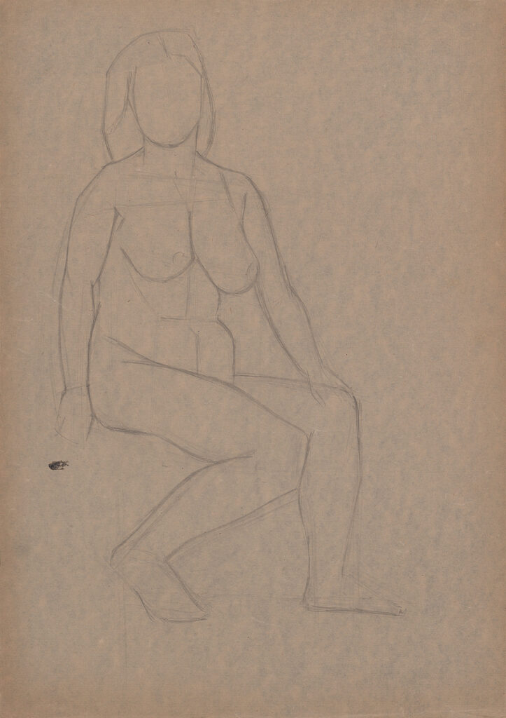 Seated female nude with head to front, torso slightly inclined 3/4, lower limbs in sharp 3/4 turn.