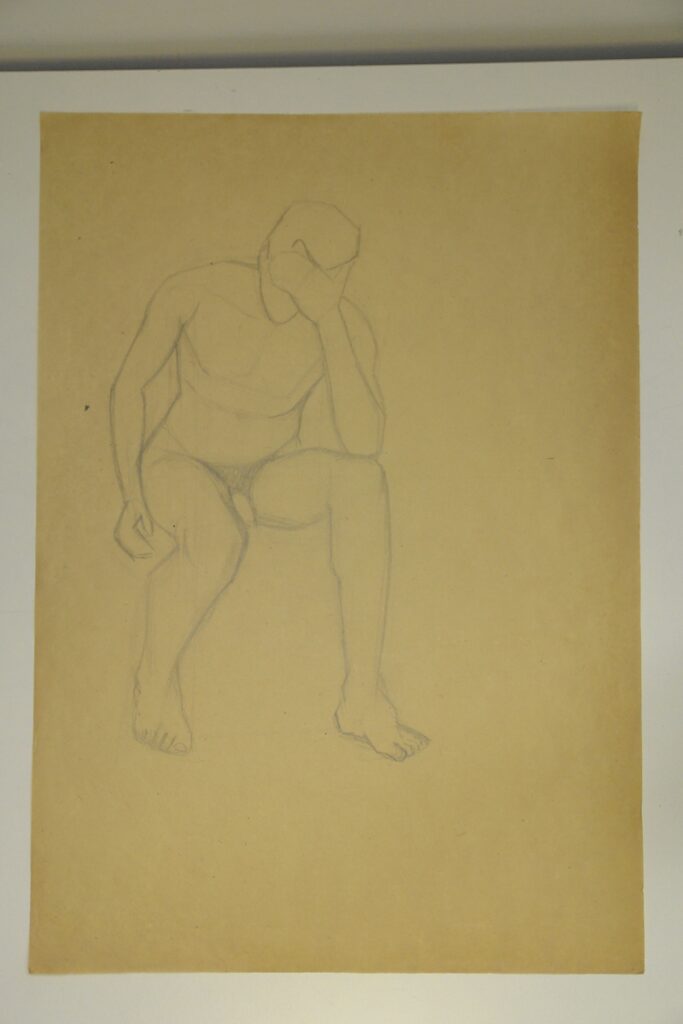 Seated male nude facing, face covered by left hand (attitude of contemplation or sorrow).