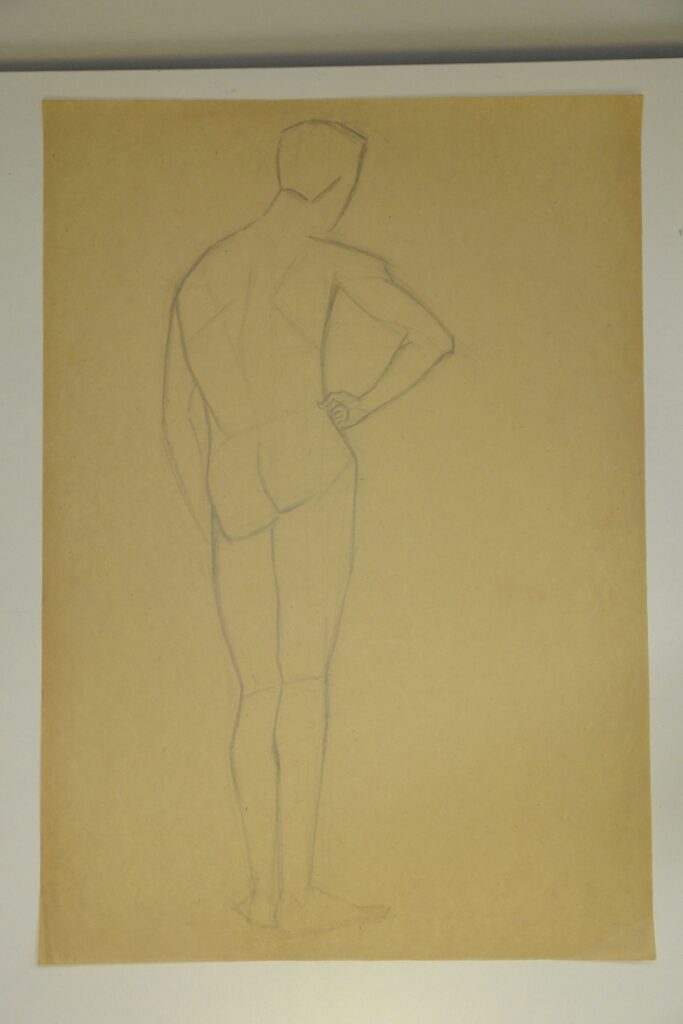 Back view of male nude in slight 3/4 tilt and right hand interpolation.