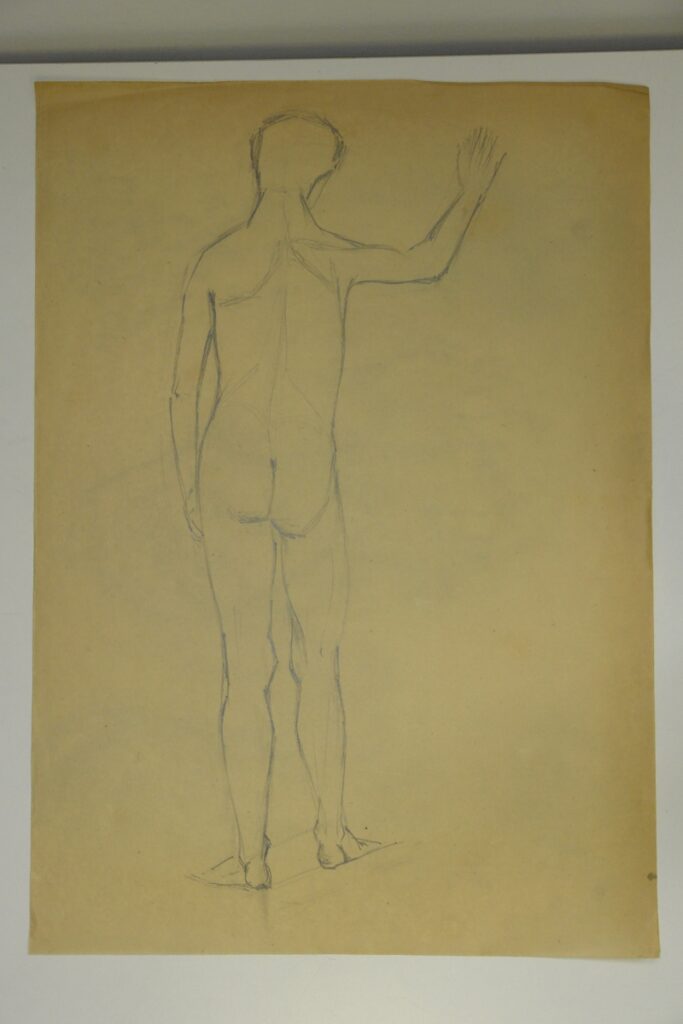 Rear view of standing male nude with raised right hand. On the verso side traces of drawings of faces.