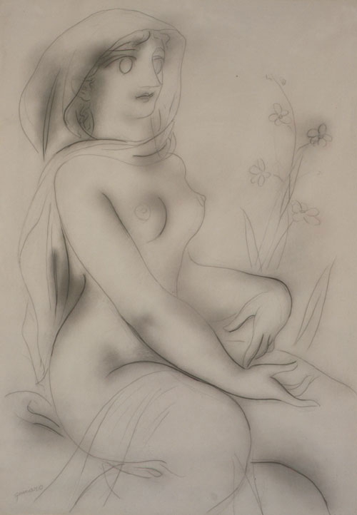 Seated female figure depicted from the knees up. It is facing three quarters. A scarf covers her head, goes around her neck and reaches down to her waist. A piece of transparent cloth covers the right thigh. The right hand rests on the corresponding thigh, while the index finger of the left hand rests on the wrist of the right hand. On the right are flowers. In places there are surfaces shaded with black charcoal.