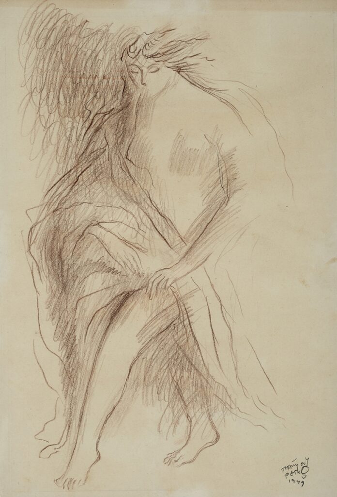 Standing, female nude with open stride in three-quarter stance. A piece of cloth covers the body starting below the right breast and reaching the height of the thighs. The hands come in front of the beginning of the left thigh. Hair blows back. Shading is used a lot. The design is quick and without details and rigor. Many elements are unclear and confusing.