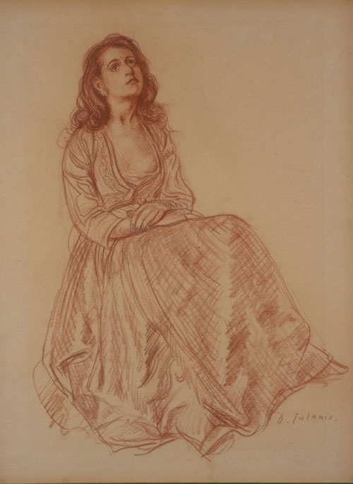 Depicted seated female figure in three-quarters pose to right. She wears a long dress and waistcoat, which opens and leaves the right breast bare. Her head is turned slightly upwards and her hair falls to her shoulders. Her arms are crossed and resting on her legs.