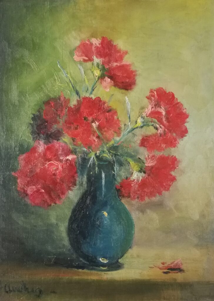 Six red carnations in a blue vase. Background abstractly created in various shades.