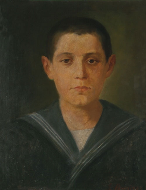 Portrait of a boy in frontal rendering. He wears a dark navy uniform with a wide collar and a white flannel inside. The background is dark green and opens to olive in the right part of the composition behind the boy’s head. The colors are plain. In the background and on the clothes, broad strokes can be seen, but they are well done. The surface of the work is quite glossy.
