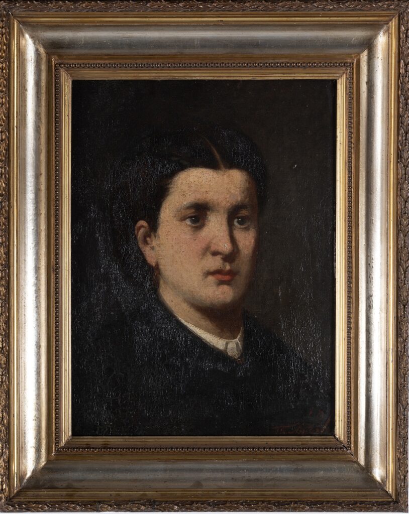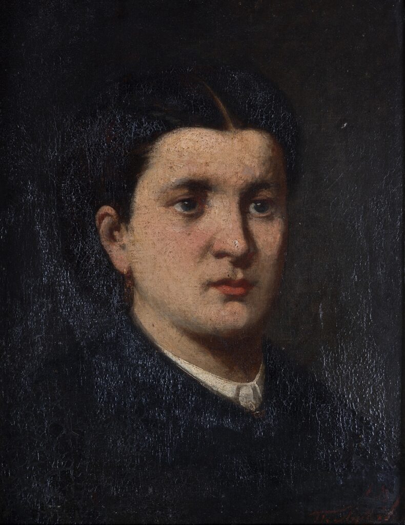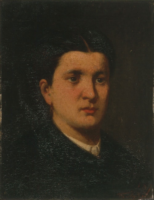 Three-quarter portrait of a female figure to the right (toward the viewer). Depicted from shoulder height up, he wears a black garment and a white shirt. An earring can be seen in her ear, while her hair is parted in the middle and held up. The background is olive-brown. The colors are plain. The work dates back to the years after the artist graduated from the School of Arts and certainly before his departure for Munich in 1875.