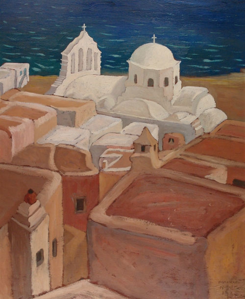 Landscape with houses on a hill, by the sea. The houses are arranged in the right part of the table. Trees are interspersed between them. On the second level a hill, with a mill on top. A mountain mass can be seen in the background. From the bottom left and towards the middle of the painting, a sea surface develops.