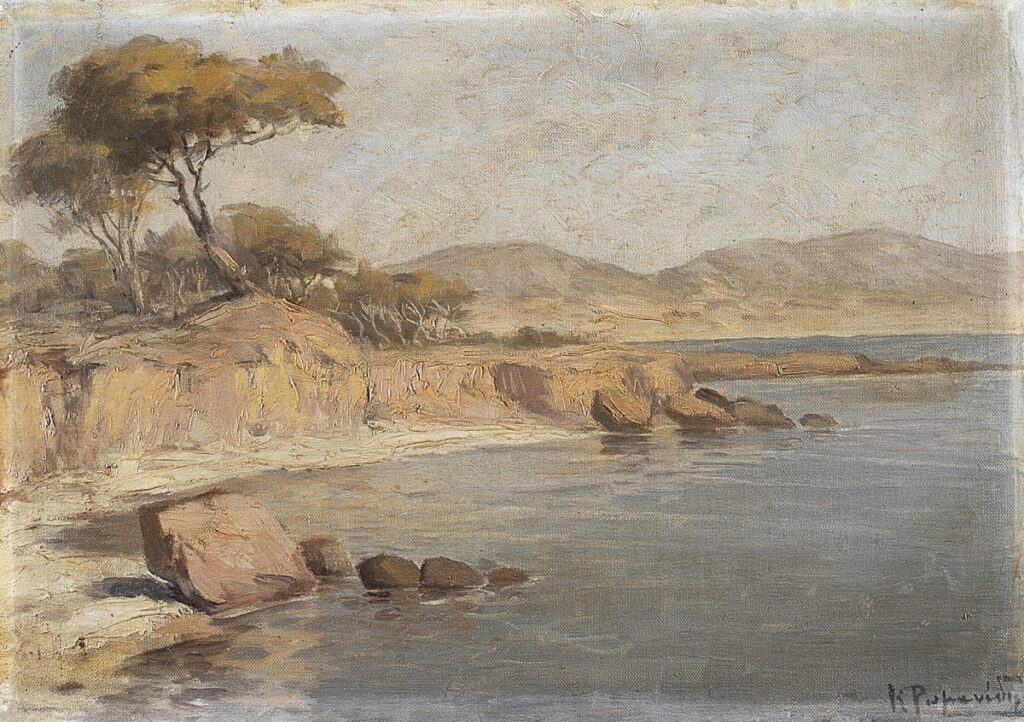Landscape with sandy beach. On the left side of the composition rocks, penetrating the sea from the left. Also on the left side there are pine trees, while in the background mountains and the sky are rendered. The colors are plain in the sea area, while the rocks are strongly impasto.