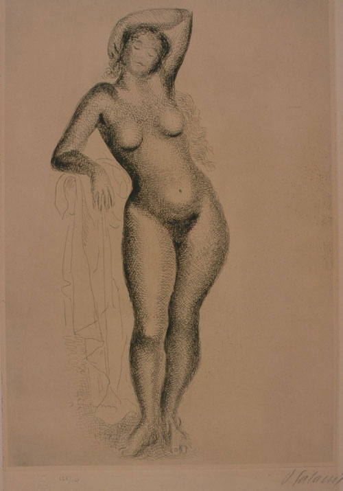 It depicts a frontal standing female figure in a comfortable position. Her right hand is passed over her head, while her left is probably resting on a column covered with cloth, which is not particularly worked by the artist. The figure’s long hair projects to the right, while the facial features are faint. The environment is not decorated.