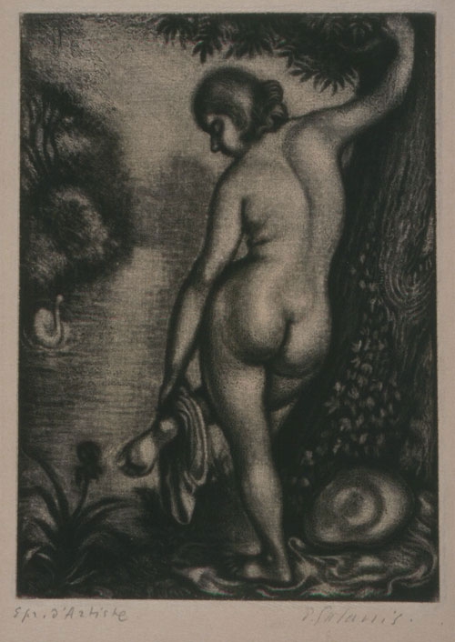 On the shores of a lake with her back to the viewer stands Leda, who turns her head to the left. She steps on a cloth spread on the ground, with her right hand she rests on the tree on the right, while with her left she holds a cloth and sweeps her right leg, which she brings diagonally in front of the left. A flower is growing in the lower left corner of the show. In the background is depicted a lake with a swan and further back trees with dense foliage. An ivy is wrapped around the trunk of the tree on the right, the leaves of which fill the upper part of the composition.