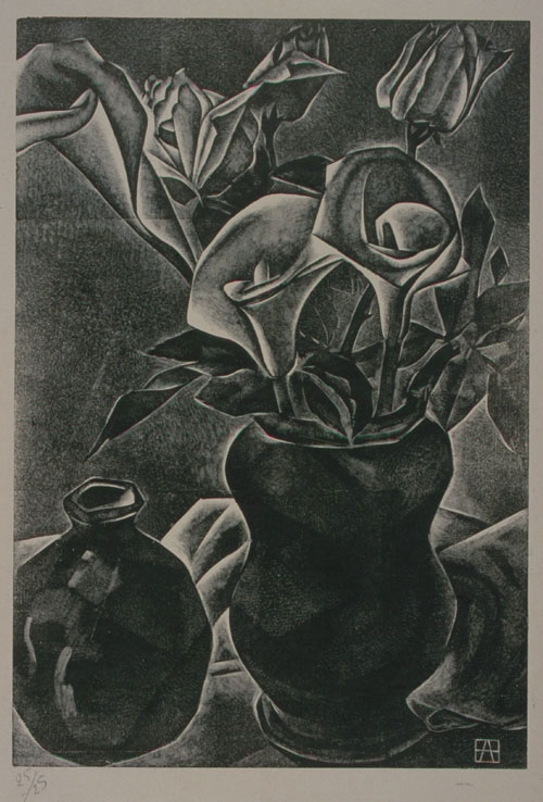 Between realistic and cubist stylistic elements, Angelos Theodoropoulos tries to compose a still life. in some unspecified interior space. On a fabric with strong pleats. To the right (toward the viewer) is a vase containing calla lilies and tulips, while to the left is a multi-layered glass vessel with a narrow neck and floral decoration. The artist probably wants the viewer to focus their attention on the flowers, given the strong lighting he gives them.