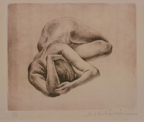 Angelos Theodoropoulos captures a naked female body in perspective, placing the head in the foreground and the legs in the background. The female figure is rendered with her head turned downwards covered by her two hands: the right (as seen by the viewer) is in front of her, while the left covers her. Her scapula, as well as the rest of her carmus of which the viewer sees the back, has a slope to the right, while the pelvis and lower limbs are set sideways with the lower leg slightly hiding the upper. Perhaps the female nude is depicted in a contracting position. The intensities in the figure’s body come from the changes in its shading.