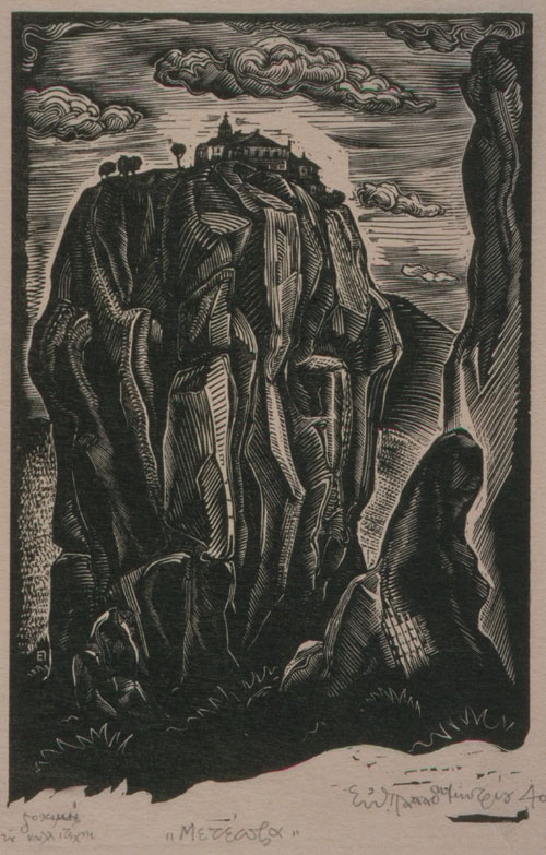 Monastic buildings are attributed to a rocky mountain, from which trees can be seen to the left. There are clouds in the sky, while to the right of the representation is depicted a small rock and a much higher one, which cannot be seen in its entirety.