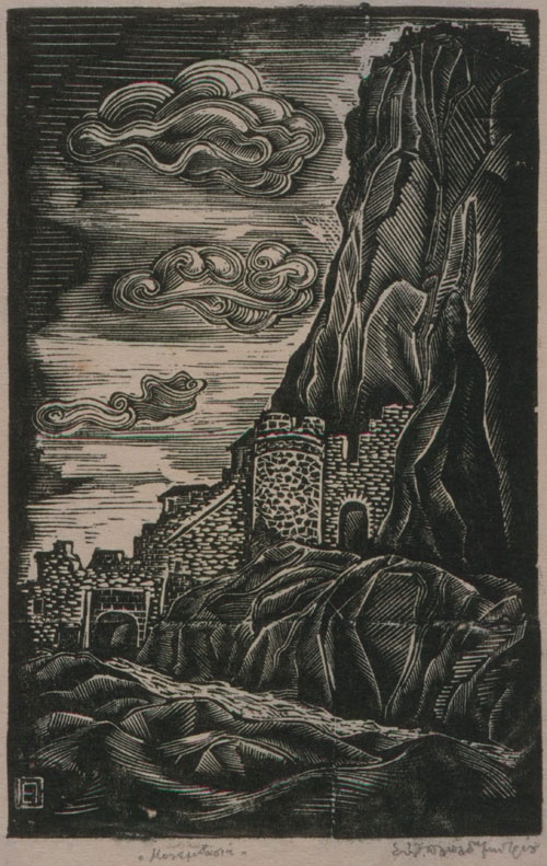 Mountain landscape with rock on the left. In the center walls with two gates and a tower. Three clouds are depicted in the sky, while the roofs of buildings can be seen behind the walls.