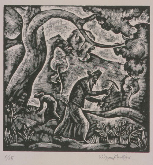 Two monks in a garden with plants and trees holding canopies in their hands engage in their ministry. On the first level, a full-length figure of a monk is shown in profile, facing right, raising the canopy. In the background, the second monk, in profile. He is rendered crouching, facing left. On the left side of the scene, a tree. In the background, mountains and sky.