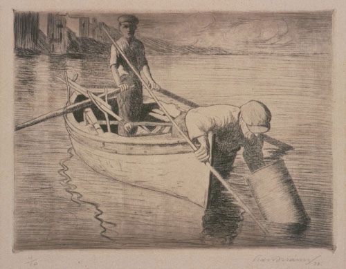 Two fishermen in a boat are depicted. One standing holds the oars and the other leaning on the railing holds a reed with his right hand and dips a basket into the water. Both wear caps. The horizon of the project is high. In the background on the left are houses.