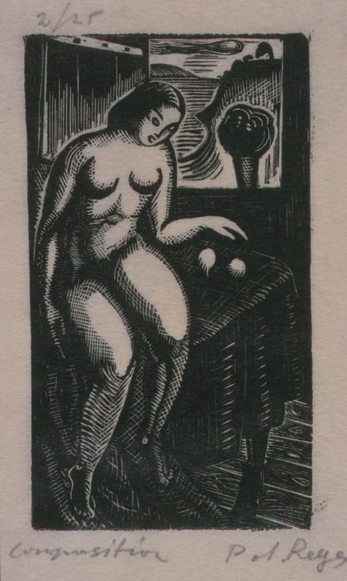In the interior of a house, a full-length, naked, female figure is depicted next to a table with a tablecloth, on which there are two fruits. Behind the woman, an open window with a pot is attributed to the second level. Through the window you can see a landscape with a slope, a small creek and the sea.