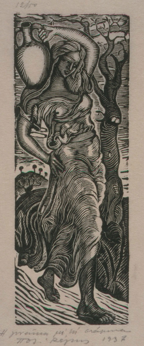 Woman in three-quarters pose moving to right. She holds a pitcher with her right hand, which passes over her head so that the pitcher rests on her left shoulder. The left hand rests on her waist. A leafless tree is rendered on the right.