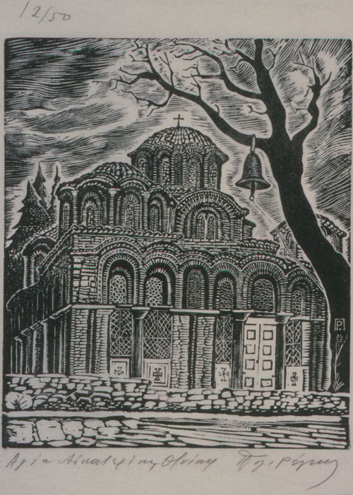 The view and the left side of the church are rendered, with a parapet and domes. On first level and to right, hanging bell on dried tree.