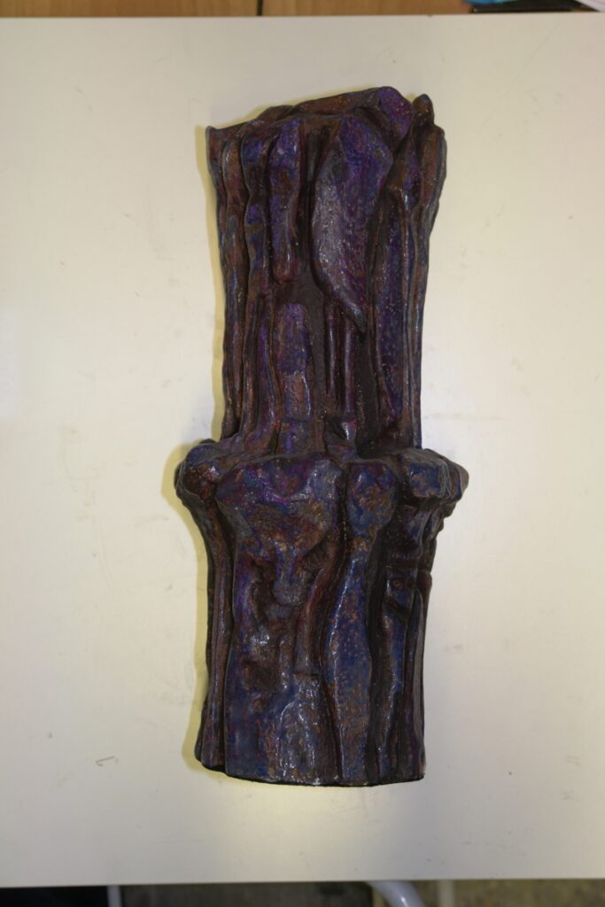 The composition consists of two successive cylindrical structures. The upper one is smaller in diameter than the lower one. The work has blue-purple colors which the sculptor mixes together with the clay.
