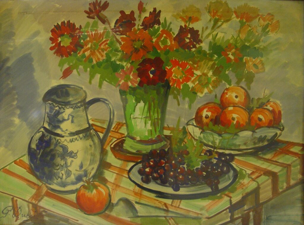 On a table laid with a checkered tablecloth, a jug with blue floral motifs can be seen on the left and a red fruit on the lower right. Above right is a vase of daisies. In front of him is a plate of grapes and at the back right is a plate of fruit.