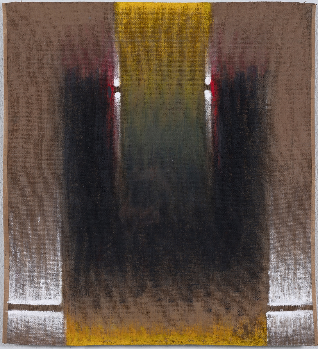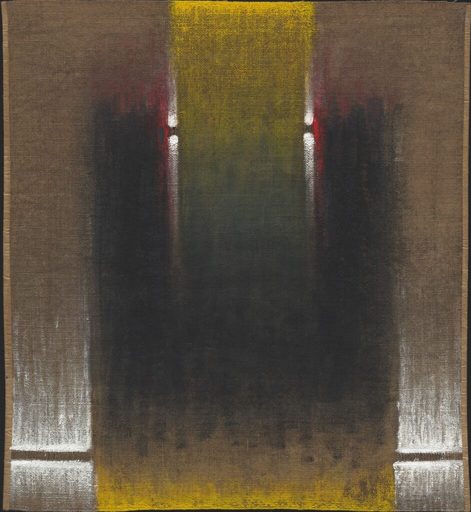 Abstract composition. Searches on the space and time of the act of painting. Rectangular visual field. White formations in the lower corners. Centrally the composition becomes darker, while upper right and left vertical white and red formations define an area yellow above and olive green below. Within the stable visual framework without escaping the limits of the personal painting code, he poses questions concerning the “Grammar” of the visual practice.