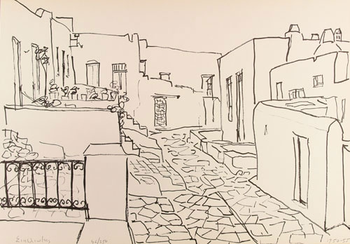 A paved road is depicted in the center of the composition. To the left and right it is surrounded by low buildings with terraces and steps. A metal railing can be seen on the left.
