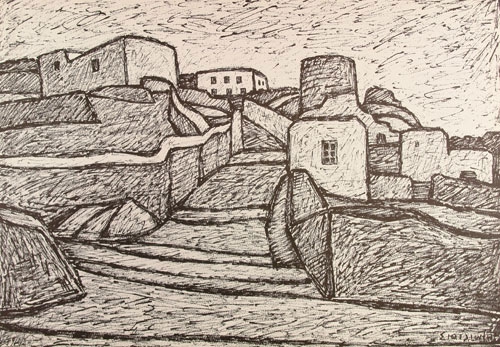 Landscape with houses of island architecture. A road is depicted in the center of the composition. To the left and right, inside the walls, cube-shaped buildings are attributed. On the right side stands out the cylindrical shell of a windmill.