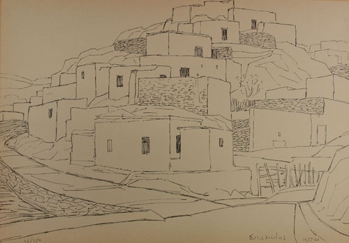 It is attributed to a settlement with typical Cycladic characteristics in the architecture of the houses: low, white, cubic – with small openings – houses, with horizontal, flat roofs, among dry stones. The settlement is growing on the side of a low hill. A road can be seen on the left of the composition, while on the right a crude wooden fence.