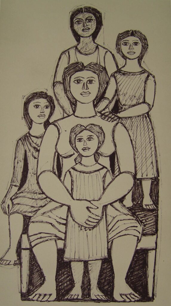 In the center is depicted a female figure sitting on a bench. The figure is bare-legged from the knee down and holds a small girl in her arms. Behind the woman are three girls. One is seated and the other two are standing. The background is gray while the figures are rendered with a black outline. The composition of the forms is pyramidal. Expressiveness in faces.
