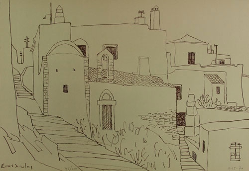 Stepped road going uphill to the left. In the center stands out a small church and houses on the right that follow the elevation of the land. The composition is roughly rendered in brown tones, against the background of the perspective surface of the paper.