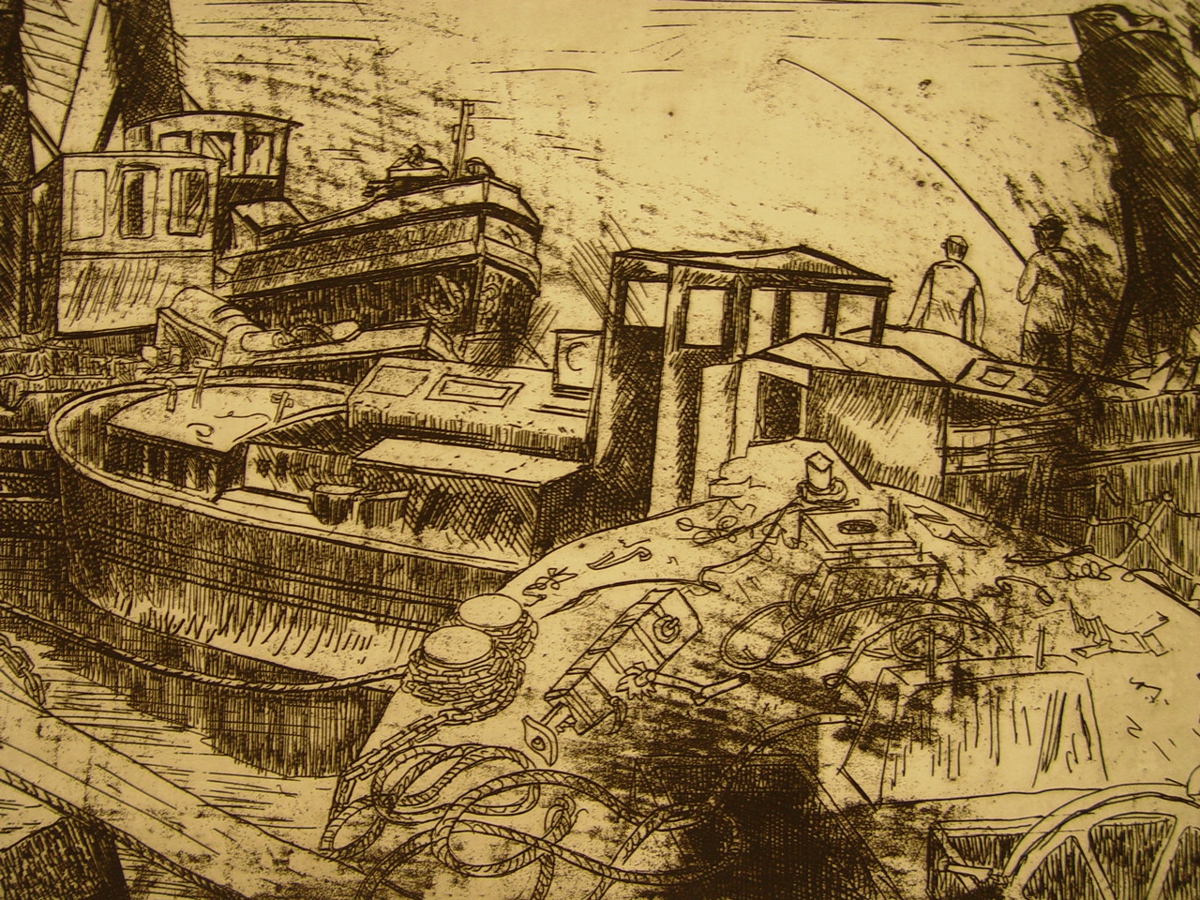 On the first level, the right bow of a ship where paraphernalia is depicted in detail, while the rudder can be seen on the right. On the second level, tugboats and barges are depicted, while in the upper right part, two male figures can be seen, of which the one on the right is fishing.
