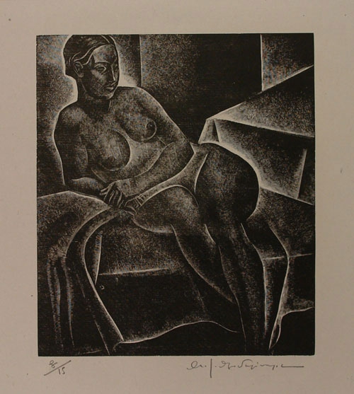 In a cubist-inspired composition, Aggelos Theodoropoulos captures the nude full-length portrait of a seated female figure inside a room, leaning slightly to the left (to the viewer), leaning on her right bent arm (to the figure), while turning her head to the right (toward the viewer). With the left hand, which rests on her abdomen, she touches her right limb while the legs are rendered crossed. The piece of furniture on which the figure sits, presumably some kind of couch, is covered with a strongly pleated cloth, while to the right of the scene a table can be seen in the corner, also covered with some cloth. There is no doubt that Angelos Theodoropoulos applies in this engraving the lessons of cubist approaches to art, mainly in the rendering of geometric volumes.