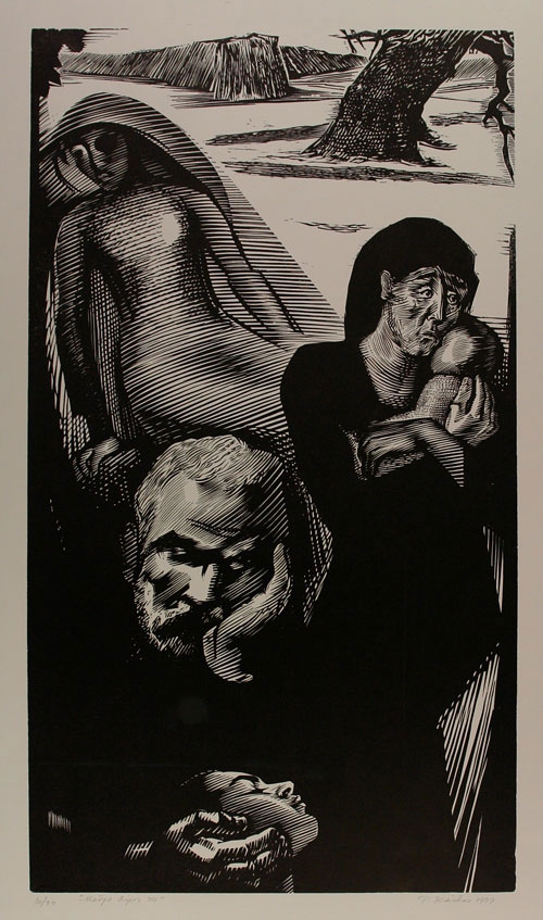 Composition of figures, in black and white. Right, woman in black clothes and headband, holding an infant in her arms. A little higher, left, seated female figure. He turns his head to the left. On the lower side, the head of an elderly male figure is attributed, resting on the palm of his left hand, with closed eyes. A hand holds the head of a young woman, rendered in profile.