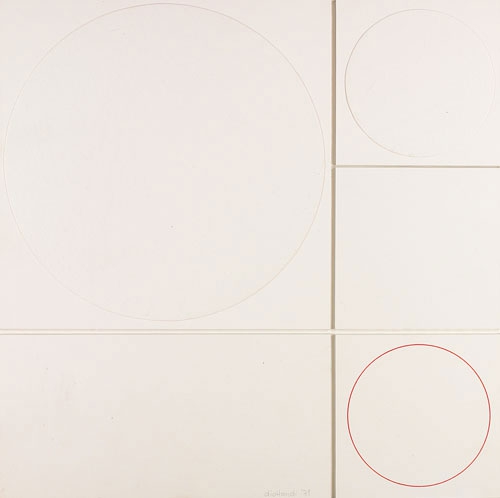 Five square pieces of cardboard. Impression of relief as a result of the difference in levels created by pasting the thick pieces of cardboard onto the -also cardboard- background. Three circles, two of which are cardboard collages. The third circle, lower right, in red ink.