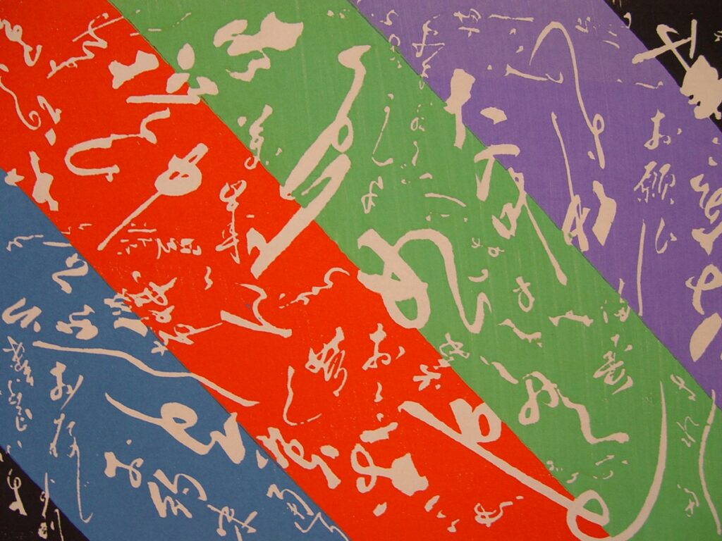 Various undefined morphologies exist along the surface, which is divided into color units diagonally: black, purple, green, red, blue and black.