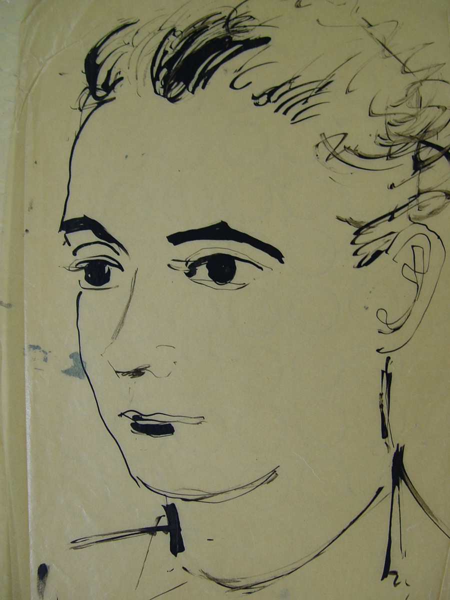 Depicts a man’s head in 3/4 view to the left. His shoulders are erased while a hint of clothing (collar) is visible.