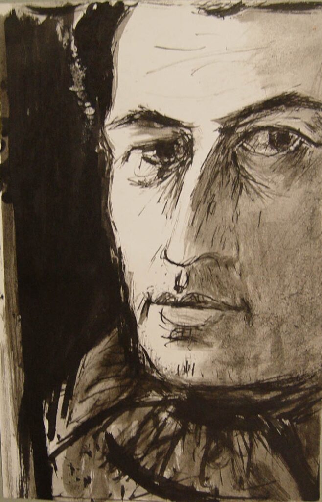 The artist paints his face on the right side, while the left side is covered in black, helping to highlight the figure. Slight inclination of the face to the left. The depicted is looking at the viewer. Rendered from shoulder height up.