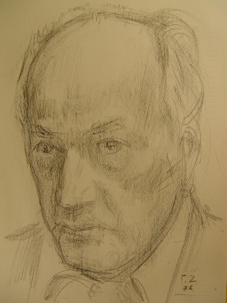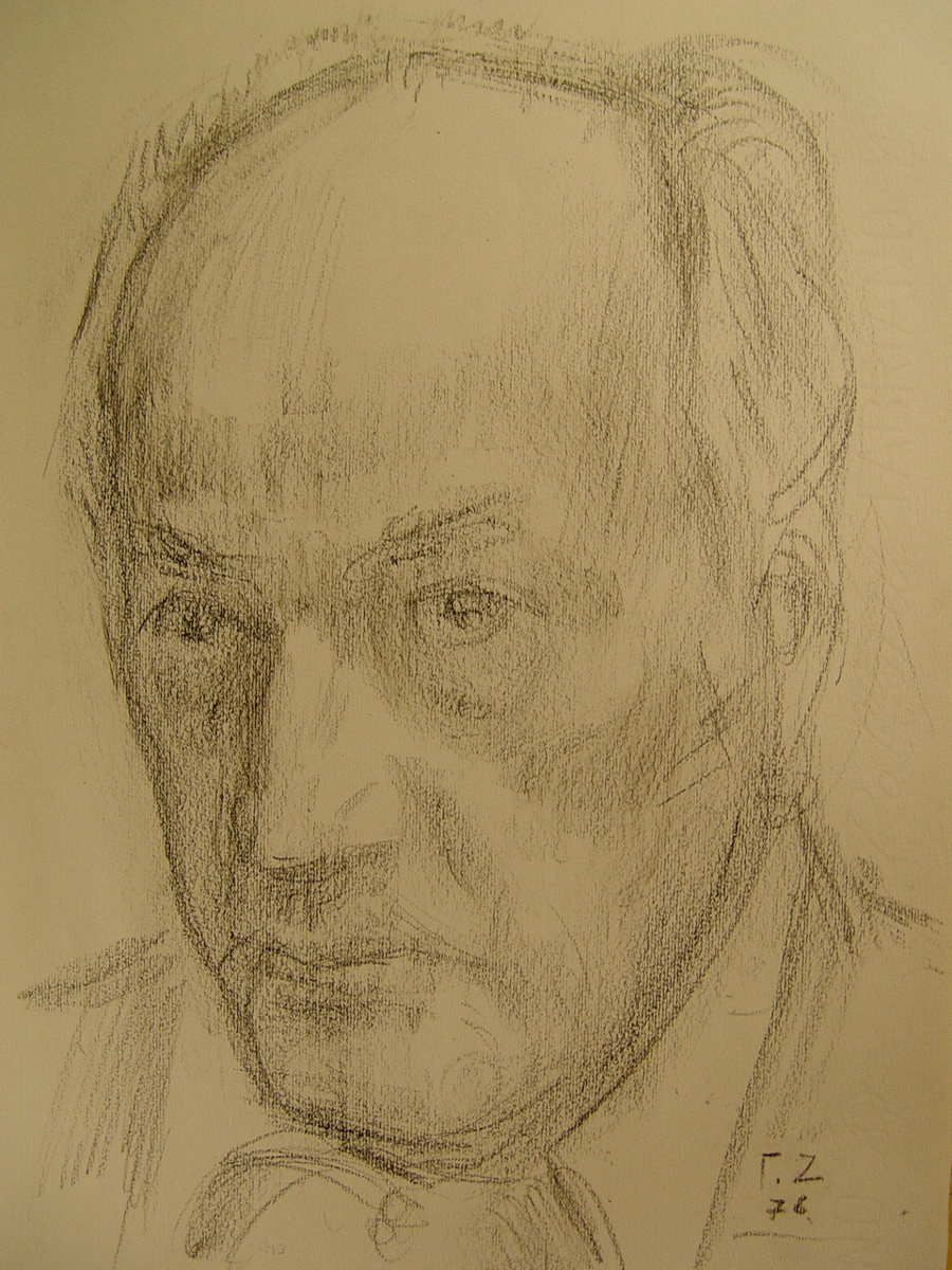 Male head slightly tilted to left, 3/4 view. Face rendered with expressive intensity, focusing on gaze. Detail and shading. The hair, jacket and collar are rendered rougher.