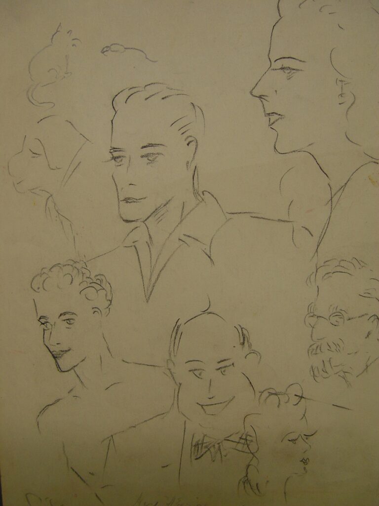 Many designs of male and female figures, animals, plants, car. On one side, in the center, the bust of a male figure in a suit and tie. Below – left and right – male bearded figures, in rough design. In the upper part, a car and a man’s face are attributed, while in the center a rose with a branch. On the back, sketches of four male and two female figures. On the upper left is a dog in profile, a cat and a mouse.