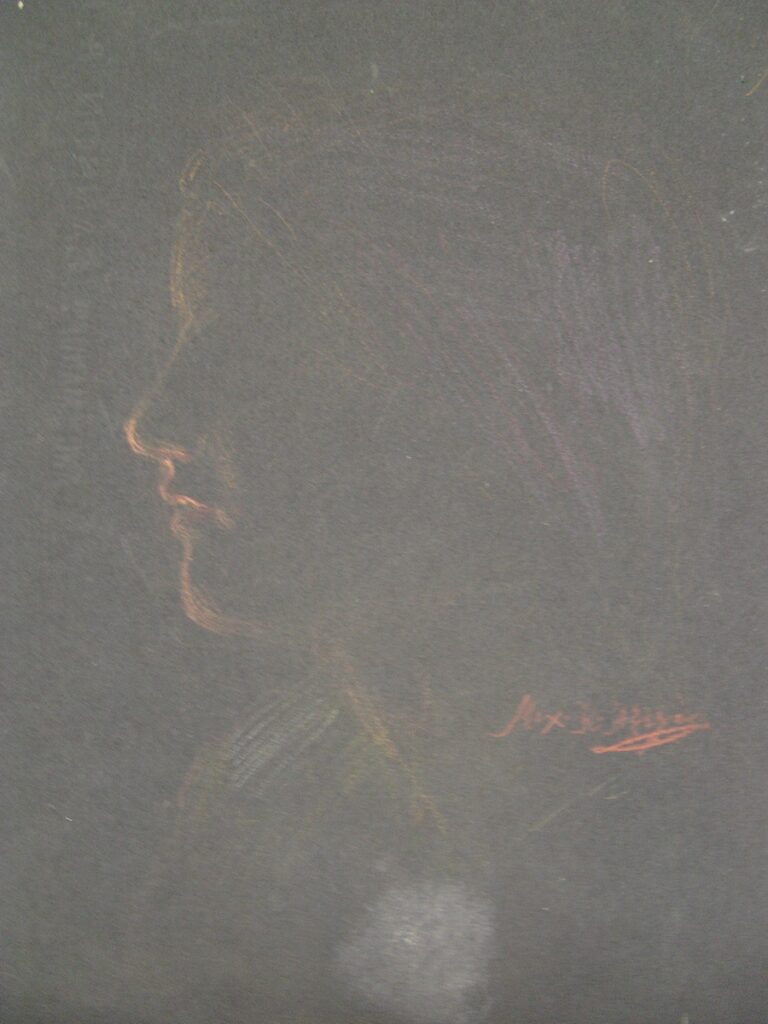 Drawing of a female figure in profile to the left (toward the viewer). Colored pencils (orange, purple, yellow) are used.