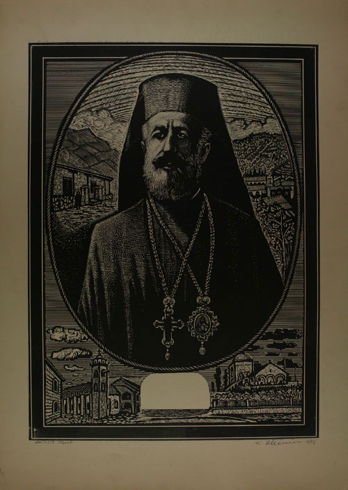 Inside a parallelogram is inscribed an oval frame in which the figure of Archbishop Makarios is depicted from the height of the waist upwards. Buildings flank him to the right and left, while in the background mountains and sky are represented. At the bottom, on the remaining surface between the outer rectangular rectangle and the inscribed oval representation of the priest, ecclesiastical buildings are depicted.